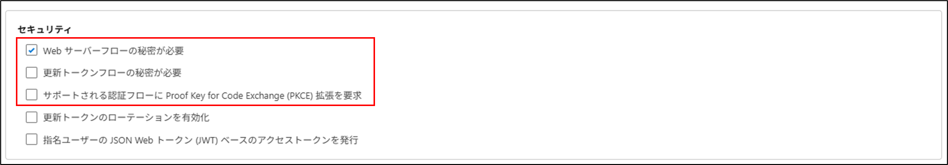Webサーバフローの秘密が必要 チェックを入れる 更新トークンフローの秘密が必要 チェックを外す サポートされる認証フローに Proof Key for Code Exchange (PKCE) 拡張を要求 チェックを外す |