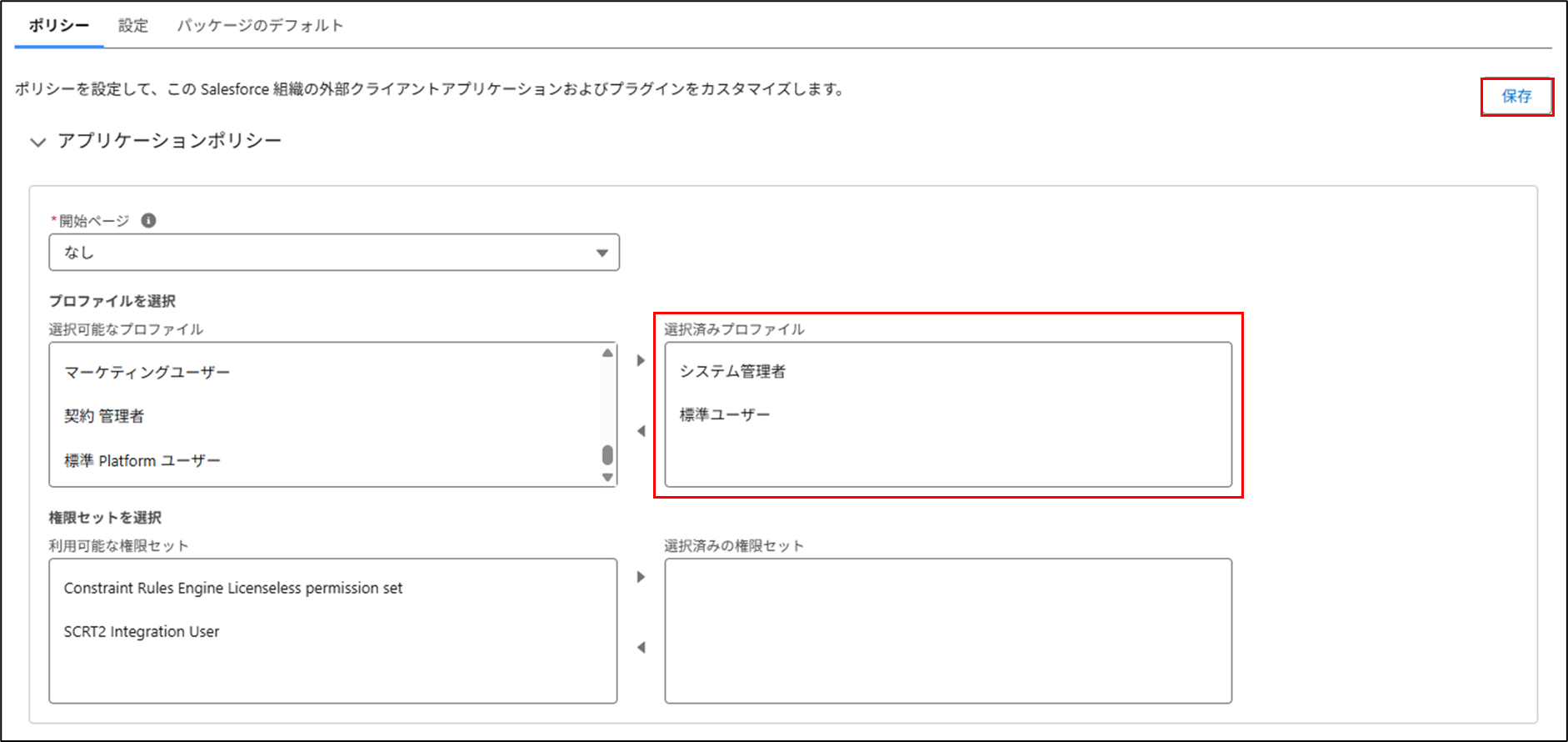 手順9.アプリケーションポリシーを展開し、「選択可能なプロファイル」からお客様のSalesforceの利用方法に沿ったプロファイルを選択済みプロファイルへ設定し、保存します。