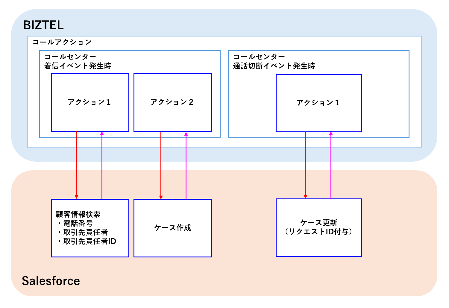 BIZTELサーバと外部CRMとのサーバ連携を行う機能となります。 外部CRMの1つであるSalesforceとの連携について、コールアクションやAPI連携IVRの機能を用いて設定した場合の動作事例を紹介します。 |