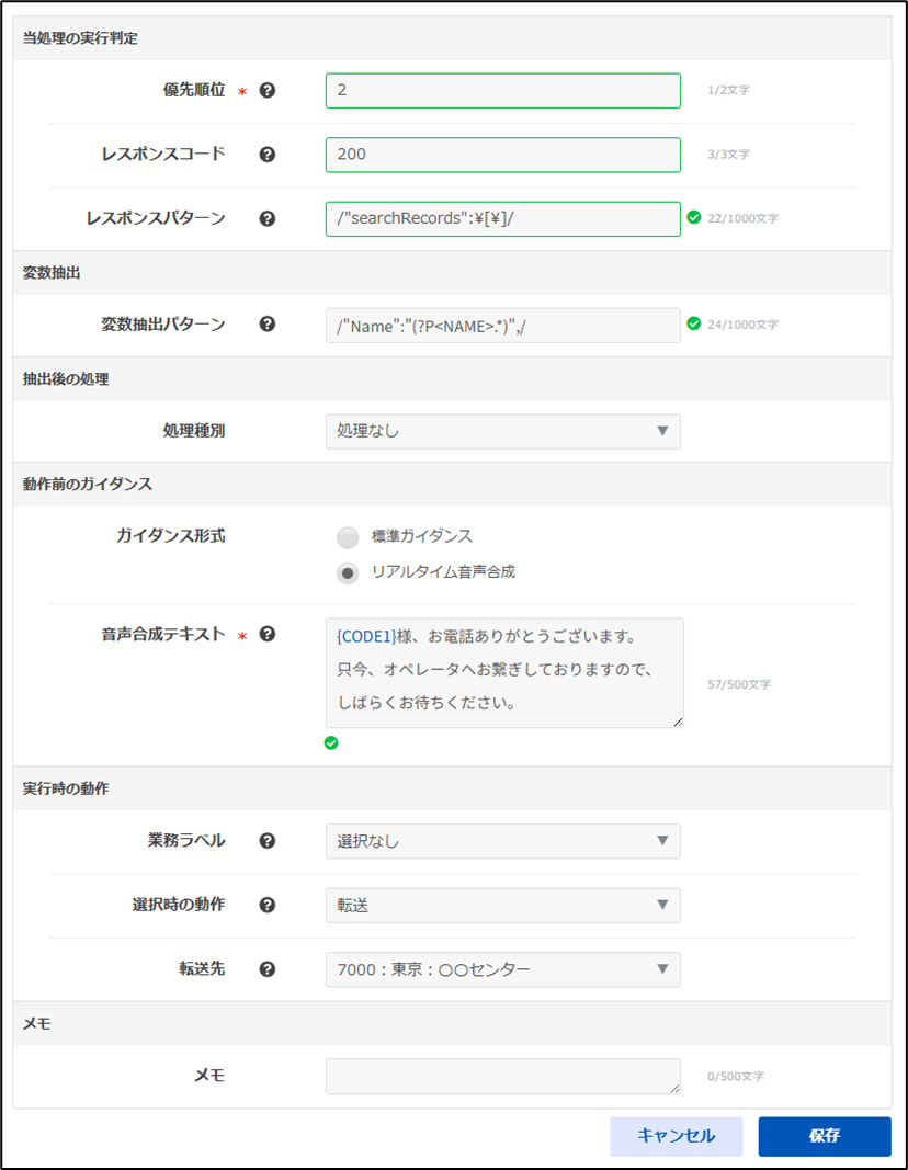 本設定が実行されると、レスポンスボディから抽出した変数を音声合成テキストとして「〇〇様、お電話ありがとうございます。」のように読み上げされた後、転送されます。