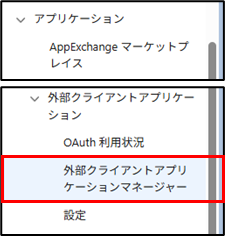 手順1.Salesforceにて、「設定」>「アプリケーション」>「外部クライアントアプリケーションマネージャー」をクリックします。