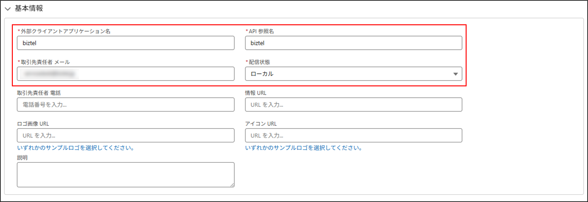 | API参照名 | 任意の内容を入力ください。 ※外部クライアントアプリケーション名を入力すると自動反映されます。 |