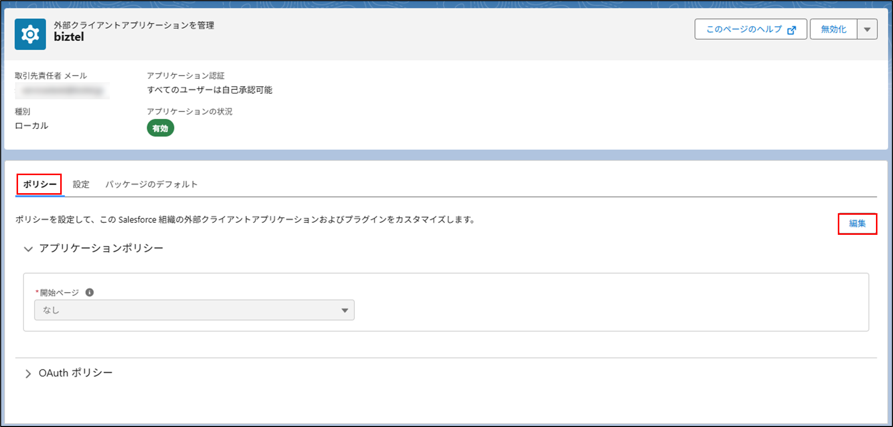 手順7.外部クライアントアプリケーションを管理の画面から「ポリシー」内の「編集」をクリックします。