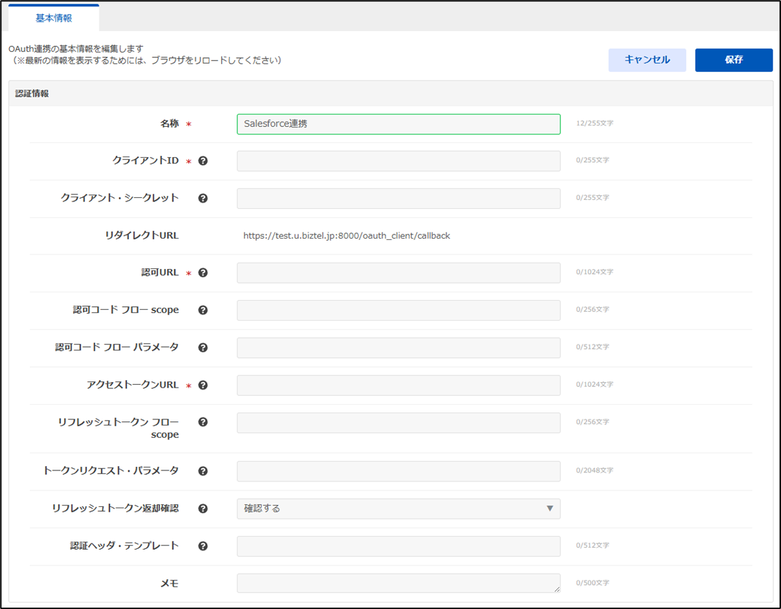| OAuthアカウント | 「1.3 BIZTELのOAuth認証の設定を行う」で登録したアカウントを選択 |