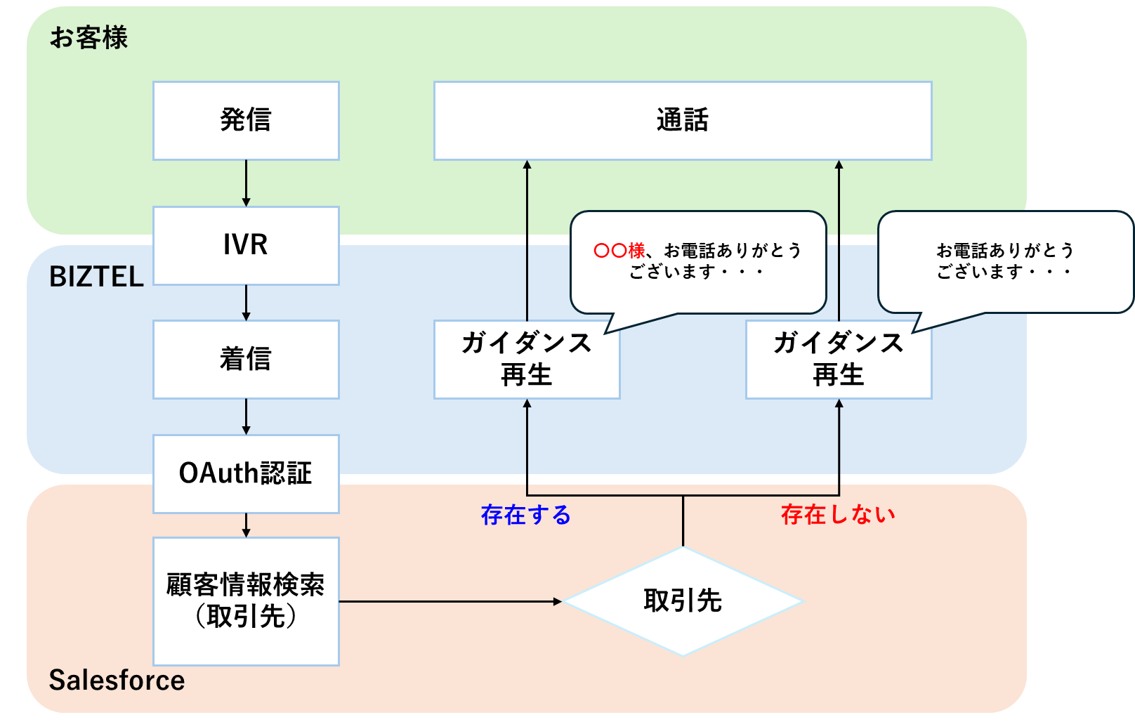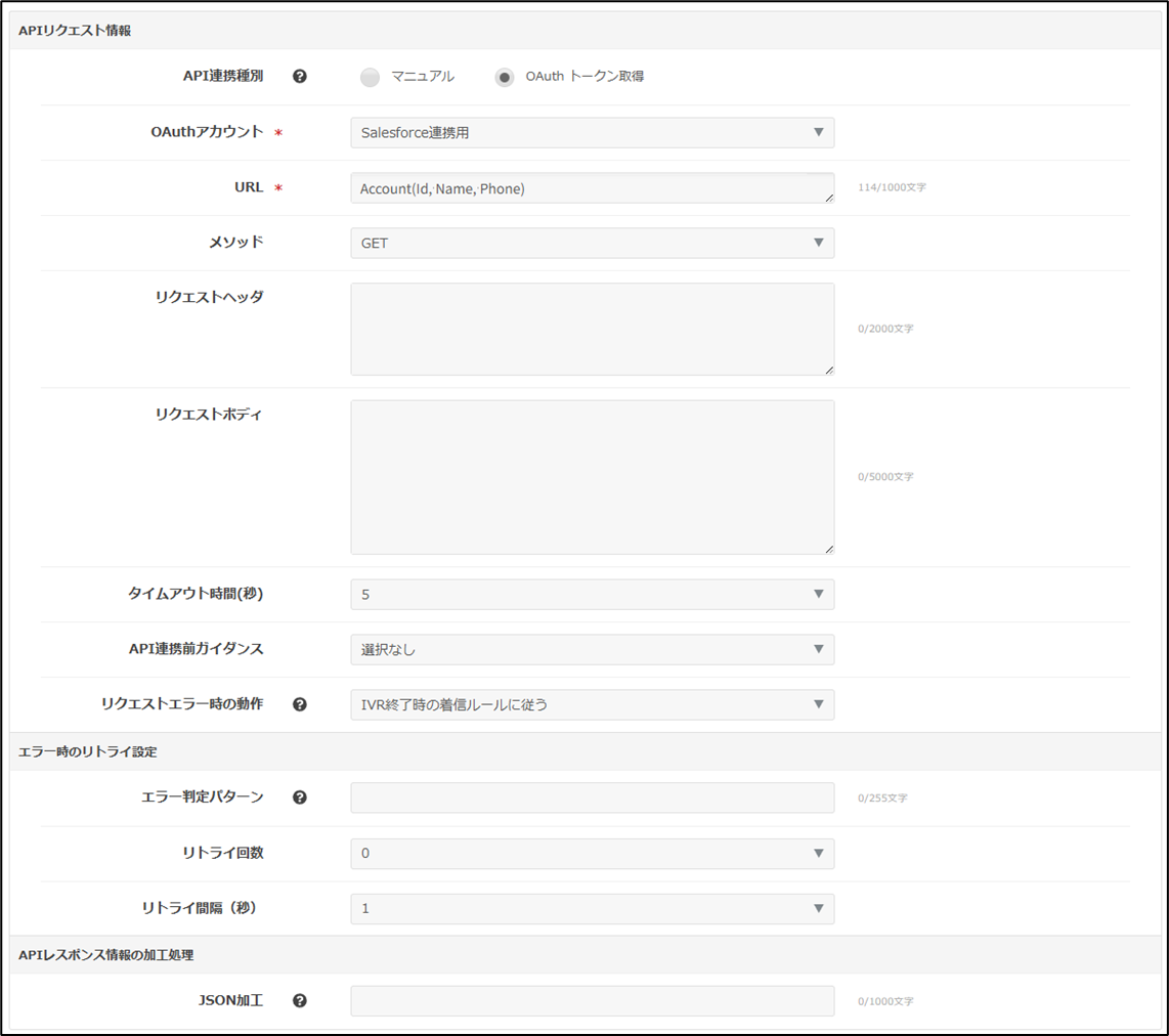 ・本事例の設定例を行うには「コールアクション連携」または「API連携IVR」オプションの契約が必須です。 ・OAuth認証を用いてWebAPIへ連携する場合は、「オプション」 > 「OAuthアカウント」の事前登録が必要となります。 ・コールアクション、IVR-APIをSalesforceで利用するにはOAuth認証が必須となります。 ※オプション > Salesforceアカウント設定はSalesforce履歴連携メニュー用となり、コールアクションには対応しておりません。 ・本事例の設定を行うためには、コールアクション、IVR-API、リアルタイム音声合成のオプション契約が必要です。 ・Salesforce側の設定は一例となりますので、設定内容・項目の詳細はセールスフォース・ジャパン社へお問い合わせください。 |