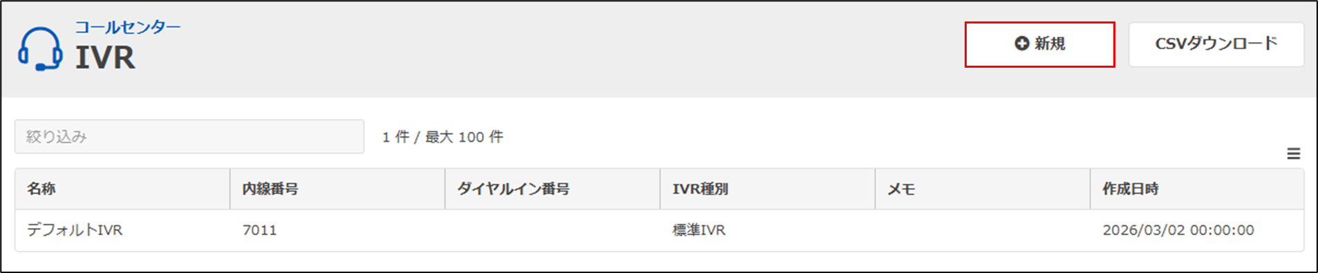 手順1.連携対象のIVRメニューから「APIレスポンス設定」タブ内の「新規」をクリックします。