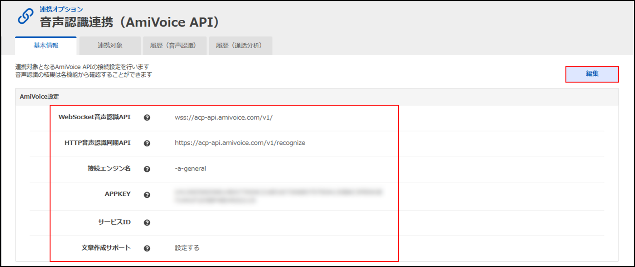 | APPKEY | AmiVoiceの「マイページ」>「接続情報」内の「APPKEY」を入力してください。 |