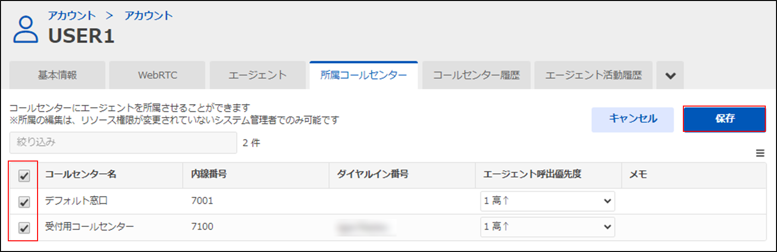 手順5.所属するコールセンターにチェックを入れ「保存」をクリックします。