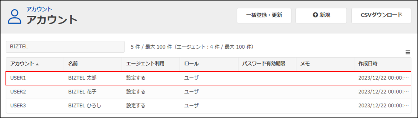 手順1.BIZTEL管理画面より「アカウント」>「アカウント」をクリックします。