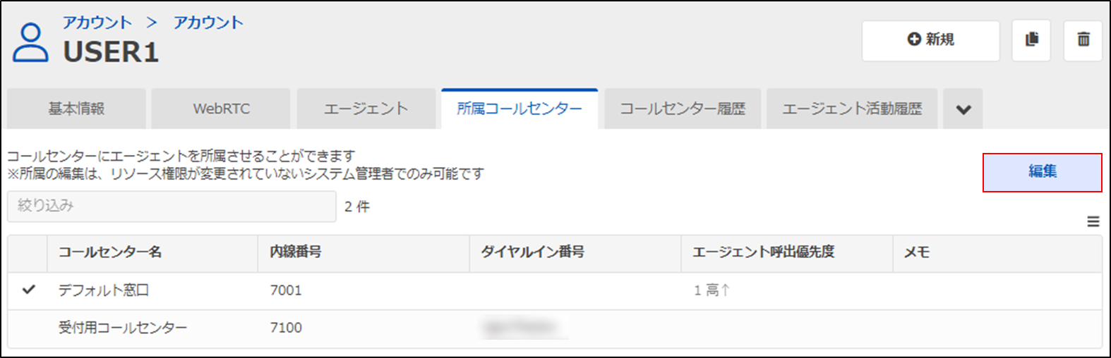 アカウント画面からシステム管理者ロールのアカウントはコールセンターへの所属を行うことができます。 ※対象コールセンターの権限が必要です。 |